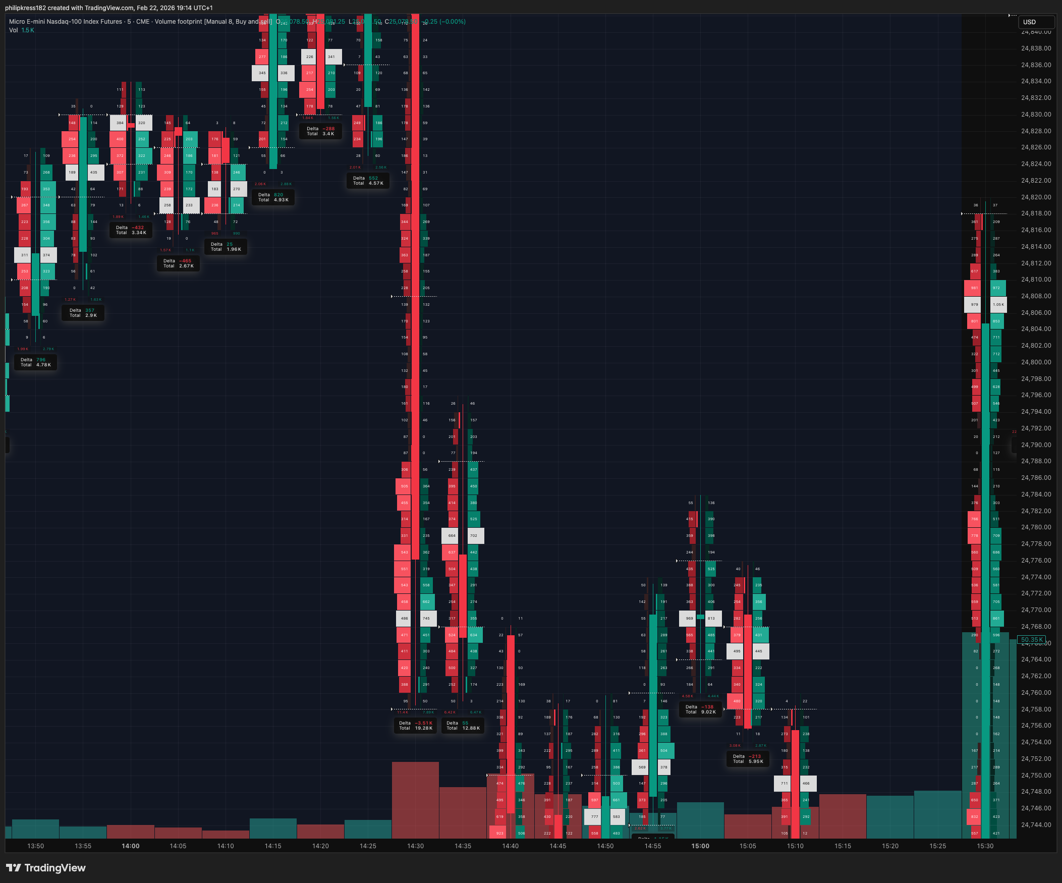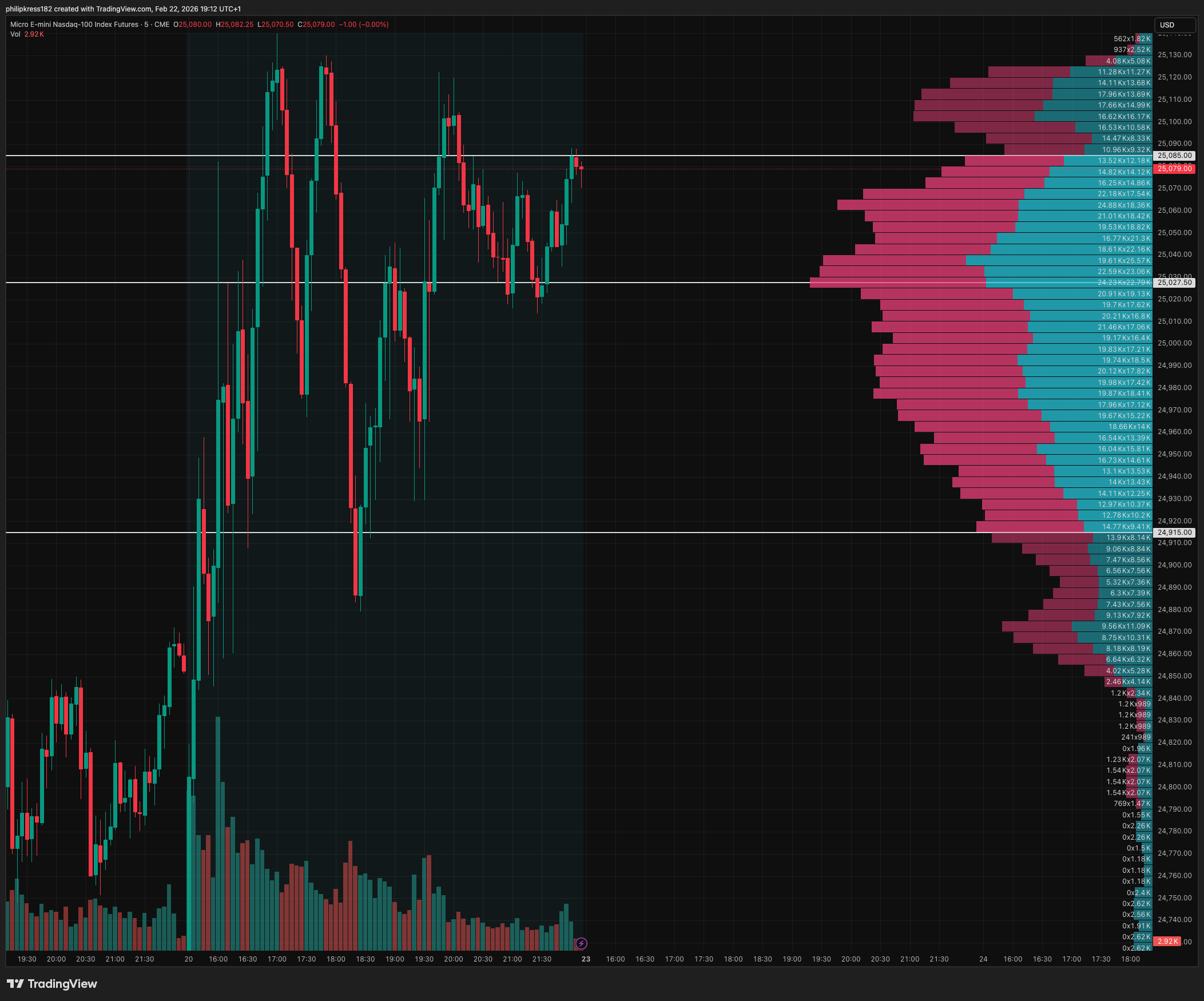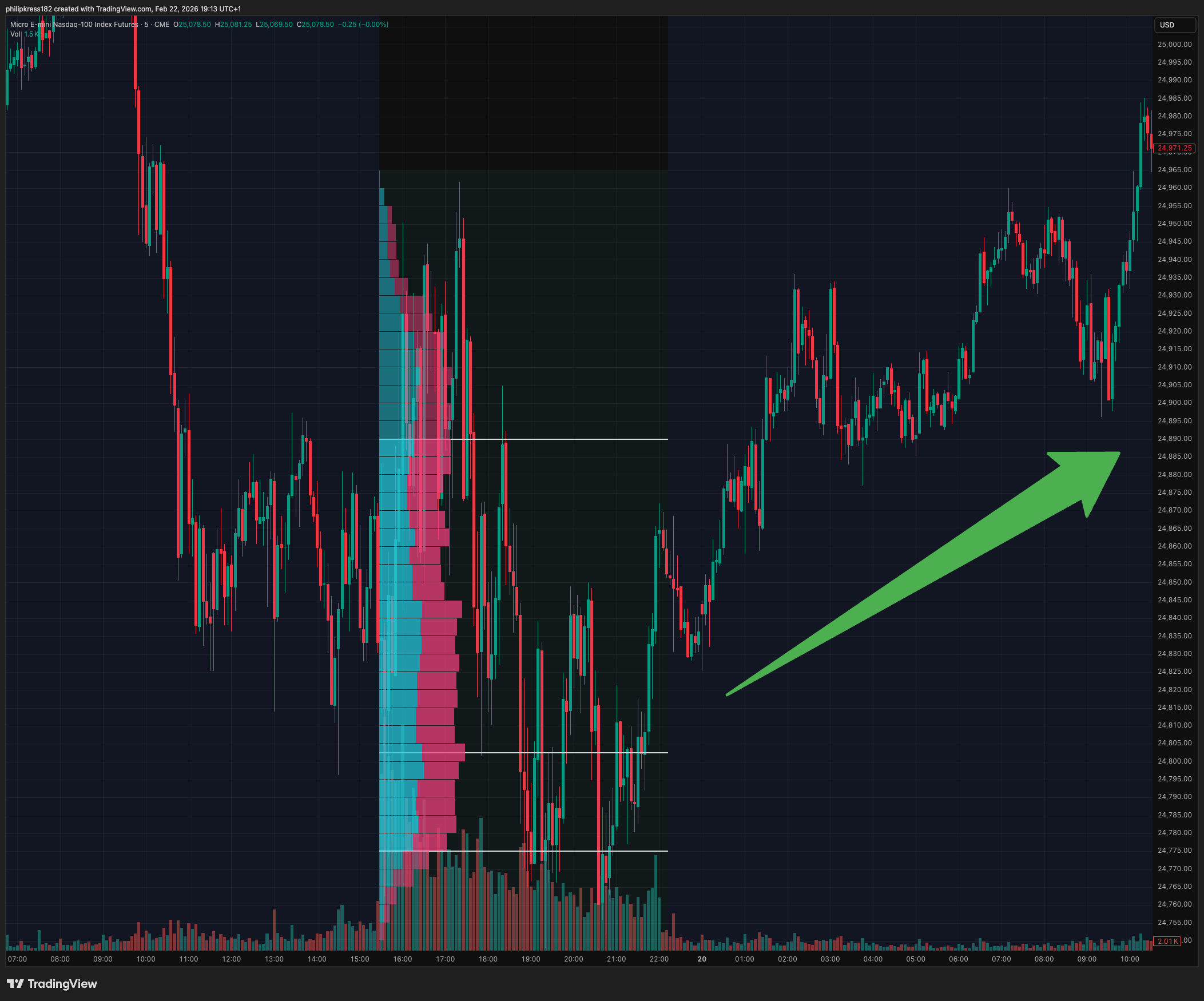 Ich analysiere den vorherigen Handelstag mit starkem Volume Profile, um die wichtigsten Akzeptanz- und Rejection-Zonen zu identifizieren. Das gibt mir den übergeordneten Bias.